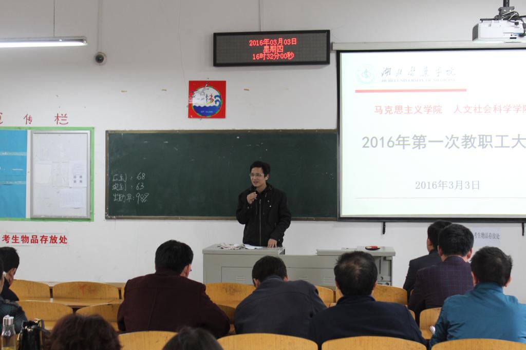 本网讯 (通讯员 孙磊)3月3日下午,太阳集团tyc33455、人文社会科学学院在5115教室召开2016年全体教职工大会,全面部署2016年各项工作和任务。学院领导、全体教师共计80余人参加大会,会议由学院分党委书记、院长刘涛主持。