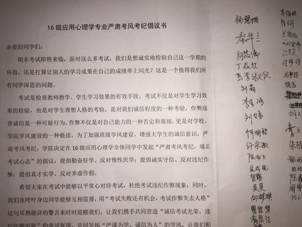 韩丽萍老师告诉大家,考试是检查学习效果的手段,也是对学生理想人格的考验,更是对诚信的考验,作弊不仅是对自己能力的否定和蔑视,更是对学校、学院学风建设的亵渎。在老师的倡议下,同学们签订了《严肃考风考纪倡议书》,从自我做起,从现在做起,让诚信常驻心中,让校园远离作弊!为严肃的考场纪律庄重的做出“诚信、文明、自律、自觉”的承诺!