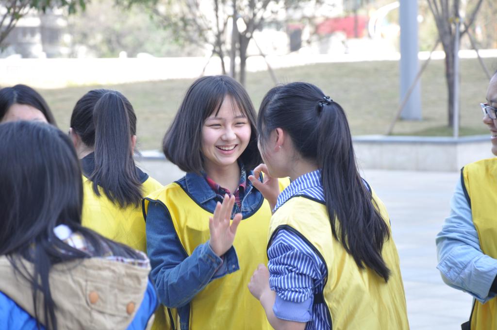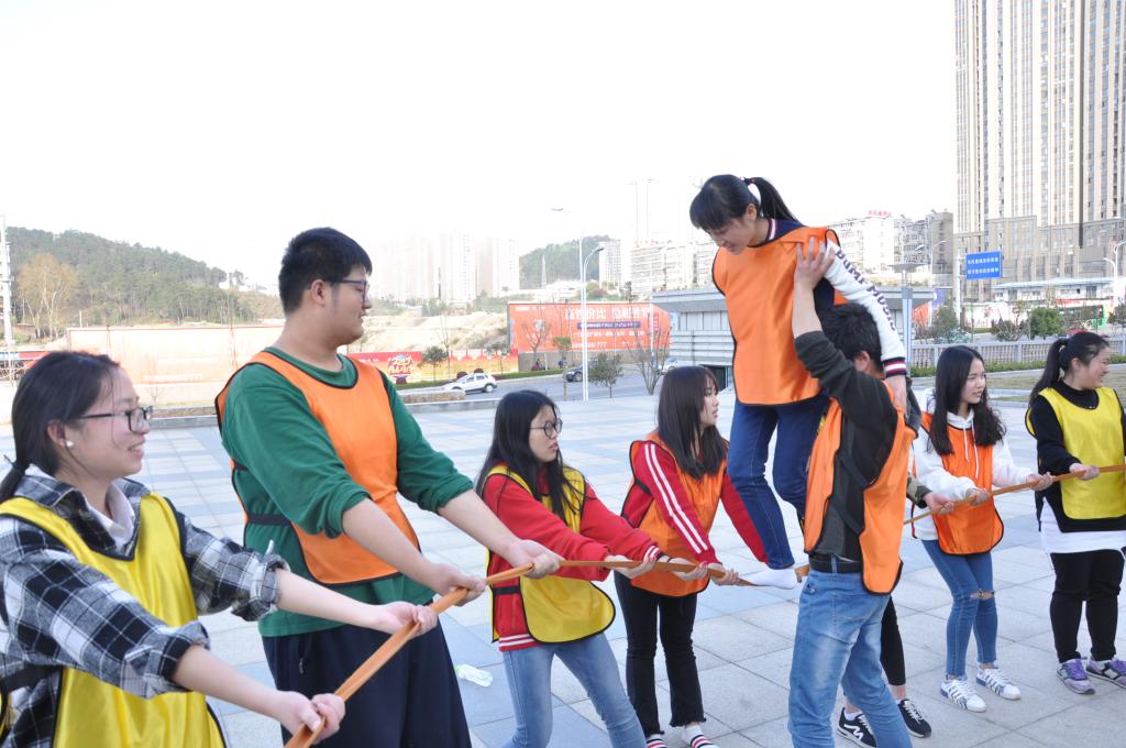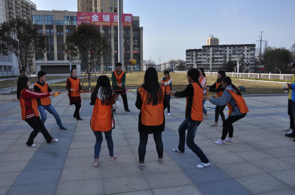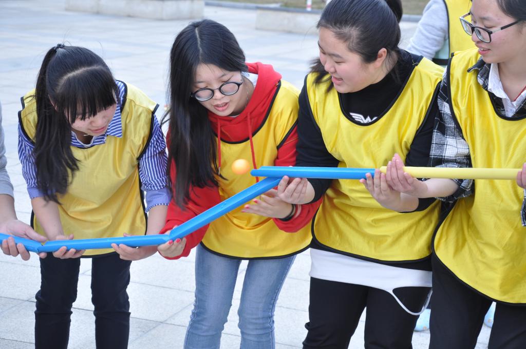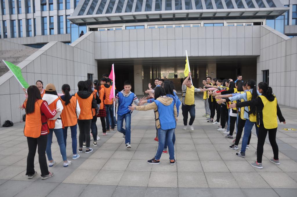 在广场上,人文学院开展了“凝心聚力同心同行”的学生素质拓展活动。在老师的引导鼓励下,同学们甩掉包袱、丢下面子,焕发出青春少年的活力与激情,迅速地融入大集体。在“破冰”环节后,同学们被分成三队:黄、蓝、橙队,分别确定了各自的队旗、口号、队歌与队形。同学们陆续开展了“你画我猜”、“诺亚方舟”、“珠行万里”、“指压板挑战”、“众人划桨开大船”等游戏。