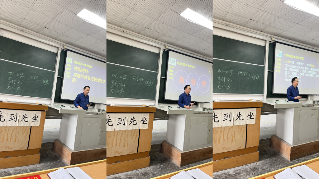 接着,陈教授在黑板上写下了三个教学目标(O):为什么学、学什么、怎么办。并进行了简要说明,本次学习,我们要搞清楚三个问题,为什么要学习习近平新时代中国特色社会主义思想,我们要学习青年习近平的哪些可贵品质、学习哪些新思想、新观点、新理论,聆听了习近平总书记的五级书记成长之路的故事后有何感想、感悟、感动和感触。