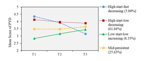 我院柴晓运博士的一项研究采用“动态的纵向视角”,以初中升入高中为过渡期背景,考察了这一时期青少年的积极发展轨迹及促进性因素。基于潜变量增长混合模型的分析发现,入学后的第一学期,高一青少年的积极发展轨迹有四类:“高开陡降”组、“高开缓降”组、“低开缓增”组和“中等稳定”组。同时,Logistic回归分析显示,在一定程度上,随时间变化的因素,即父母卷入、教师卷入和意向性自我调节可以区分青少年积极发展轨迹的类型,是青少年积极发展的促进性因素。该研究在一定程度上,首次清晰地揭示了我国青少年在高中过渡期的第一学期内的差异化发展轨迹,为学校过渡期青少年的发展历程研究增添了新的实证依据。同时,本研究也为基于“青少年积极发展观”科学设计学校过渡期“开学第一课”,促进家校协同提供了新的思路。