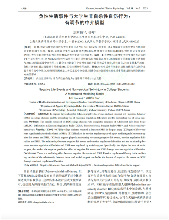 本网讯(通讯员 朱明一)tyc33455cc太阳成集团人文社会科学学院应用心理学系一直关注大学生的心理健康素养研究。近日,刘寒梅老师的科研成果“负性生活事件与大学生非自杀性自伤:一个有调节的中介模型”发表在《中国临床心理学杂志》(CSSCI)。该文主要探讨了负性生活事件与大学生非自杀性自伤的关系及其情绪调节困难和社会支持在其中的作用机制。