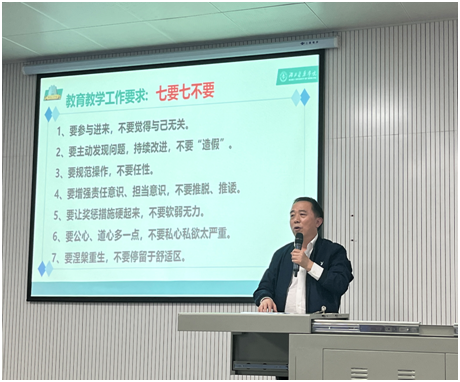 陈全新对改进学院本科教育教学工作提出了相应要求和建议,概括为“七要七不要”,即要参与进来,不要觉得与己无关;要主动发现问题,持续改进,不要“造假”;要规范操作,不要任性;要增强责任意识、担当意识,不要推脱、推诿;要让奖惩措施硬起来,不要软弱无力;要公心、道心多一点,不要私心私欲太严重;要涅槃重生,不要停留于舒适区。