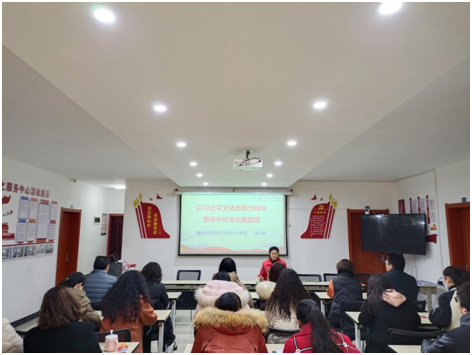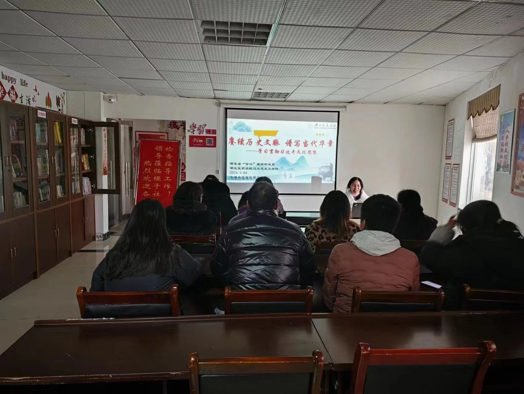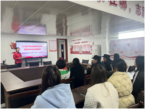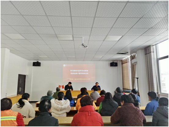 2024年3月7日下午,马克思主义副院长、教授陈全新受邀到十堰市茅箭区二堰街道百二河村宣讲习近平文化思想,宣讲的题目为《学习贯彻习近平文化思想传承弘扬十堰市特色文化》,主要内容包括为什么建设中国特色社会主义文化、为什么要坚持马克思主义在意识形态领域指导地位的根本制度、为什么要用社会主义核心价值观凝心聚力、如何提升国家文化软实力和中华文化影响力、传承弘扬十堰市特色文化等,十堰市特色文化包括武当道教文化、汽车文化、汉水文化、移民文化、诗经文化、医药文化、恐龙文化、皇家文化等。百二河村干部群众20余人听取了讲座。