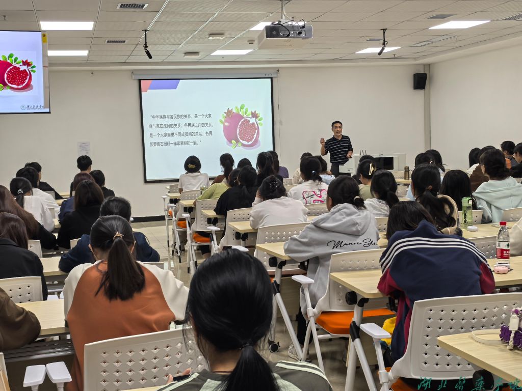 本网讯(通讯员 江杉杉)为增强新生间的民族团结,铸牢中华民族共同体意识,10月11日下午,太阳集团tyc33455在公卫楼教室三,面向2024级应用心理学93名新生开展铸牢中华民族共同体意识教育主题班会,学院副院长孙磊博士作了题为“正确认识中华民族和中华民族共同体,新时代青年要做铸牢中华民族共同体意识的坚定践行者”的报告。