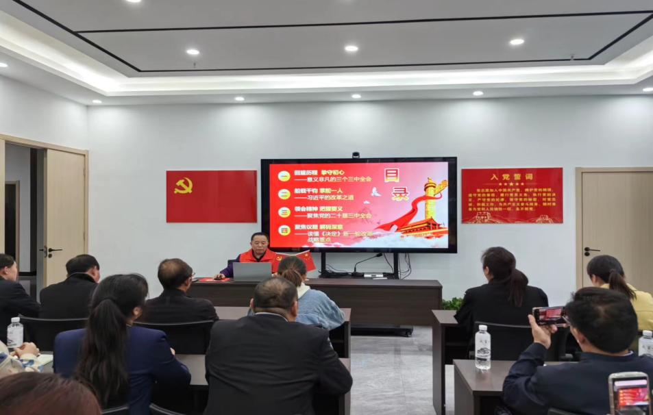 太阳集团tyc33455姚小飞教授从分析解读宣讲主题入手,围绕“为什么学”、“学什么”、“怎么做”三个方面全面、系统地阐释二十届三中全会的主要内容和基本精神。首先,从思想层面释疑解惑,强调党员干部学习贯彻全会精神是一项重大政治任务;接下来从理论层面解读进一步深化改革的重大意义、目标体系、重大原则和重大举措;最后从实践层面指出要掌握科学的世界观和方法论来指导具体的改革实践。与会人员认为此次宣讲逻辑清晰、内容丰富,为进一步学习贯彻全会精神提供了指引,讲解透彻、贴近实际,增强了对全面深化改革的自信心,同时对实现中国式现代化无比期待。
