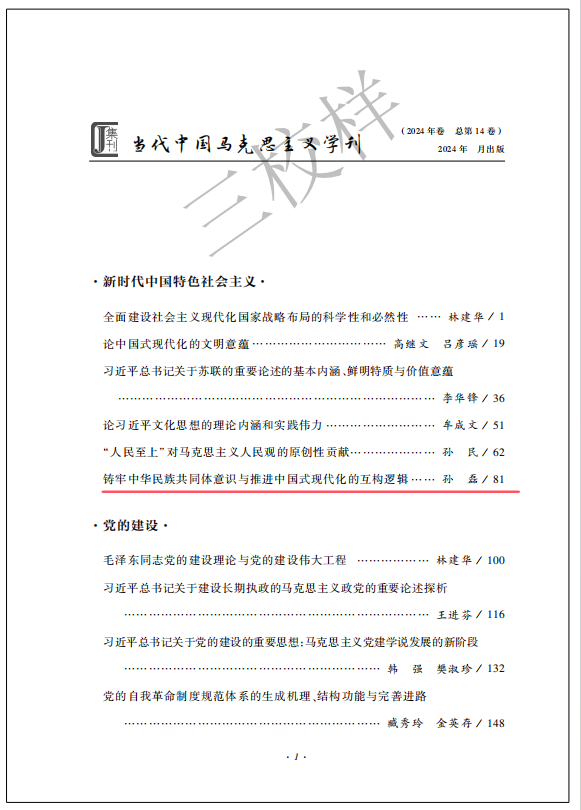 本网讯(通讯员 陈玫霖)近日,《当代中国马克思主义学刊》(2024年卷)(总第14卷)由社会科学文献出版社出版。我校太阳集团tyc33455孙磊博士的论文《铸牢中华民族共同体意识与推进中国式现代化的互构逻辑》被该学术集刊全文收录。《当代中国马克思主义学刊》(2024年卷)由新时代中国特色社会主义、党的建设、世界社会主义、思想政治教育四个板块组成,共收录23篇国内知名学者高质量学术文章。《当代中国马克思主义学刊》致力于关注当代中国马克思主义理论建设,直面时代课题,努力构建具有中国特色、中国风格、中国气派的马克思主义理论学科话语体系。该刊物已被集刊全文数据库(www.jikan.com.cn)收录,被国内多所知名高校、科研院所图书馆收藏。