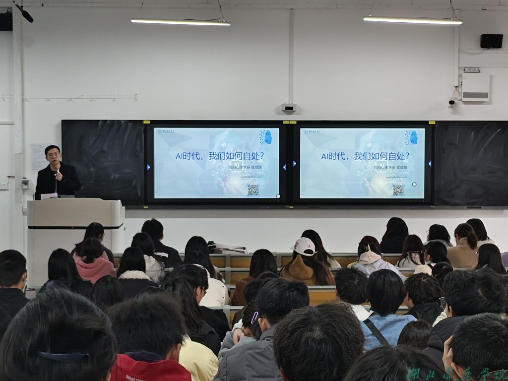 在讲座中,翟成蹊老师深入剖析了AI给社会生活各方面带来的变革,从工作模式的转变,到人际交往方式的更迭,让同学们深切感受到AI的巨大影响力。随后,他结合心理学专业知识,分享了在AI浪潮下,同学们如何保持自身独特价值,以及在学习中如何善用AI技术的方法。同学们全神贯注,纷纷被生动的讲解和深刻的见解所吸引,积极参与互动答题,现场气氛热烈,思维的火花不断碰撞。