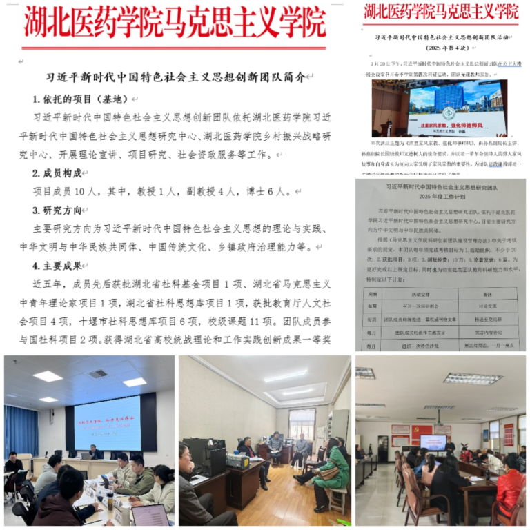 团队成员积极努力,教科研创新取得新进展。2025年第一季度,尉迟光斌、孙磊、李亚老师积极申报教育部人文社科研究项目3项,孙磊获批2024年人才启动金项目并发表学术论文《新时代中华民族观的基本内涵与理论特征探赜》,王刚老师还积极申报教学创新大赛。近期,团队成员还将围绕十堰社科思想库2025年度调课题申报、tyc33455cc太阳成集团习近平新时代中国特色社会主义思想研究中心、廉洁文化研究中心研究项目申报等进行集中研讨,积极凝练选题申报各类项目。