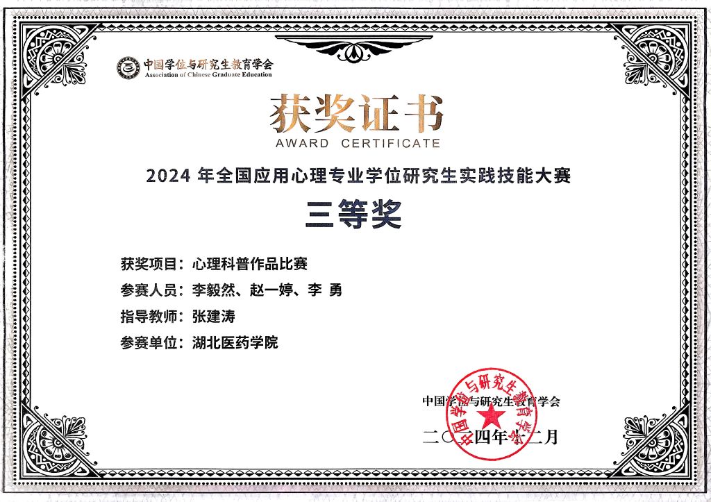 本网讯(通讯员 柴晓运)近日,我校应用心理专硕团队传来捷报,张建涛博士指导研究生在全国应用心理专业学位研究生实践技能大赛中荣获“心理科普作品”比赛三等奖。本次大赛由中国学位与研究生教育学会和应用心理专业硕士教学指导委员会主办,旨在推动应用心理专业硕士的实践能力提升和专业素养培养。