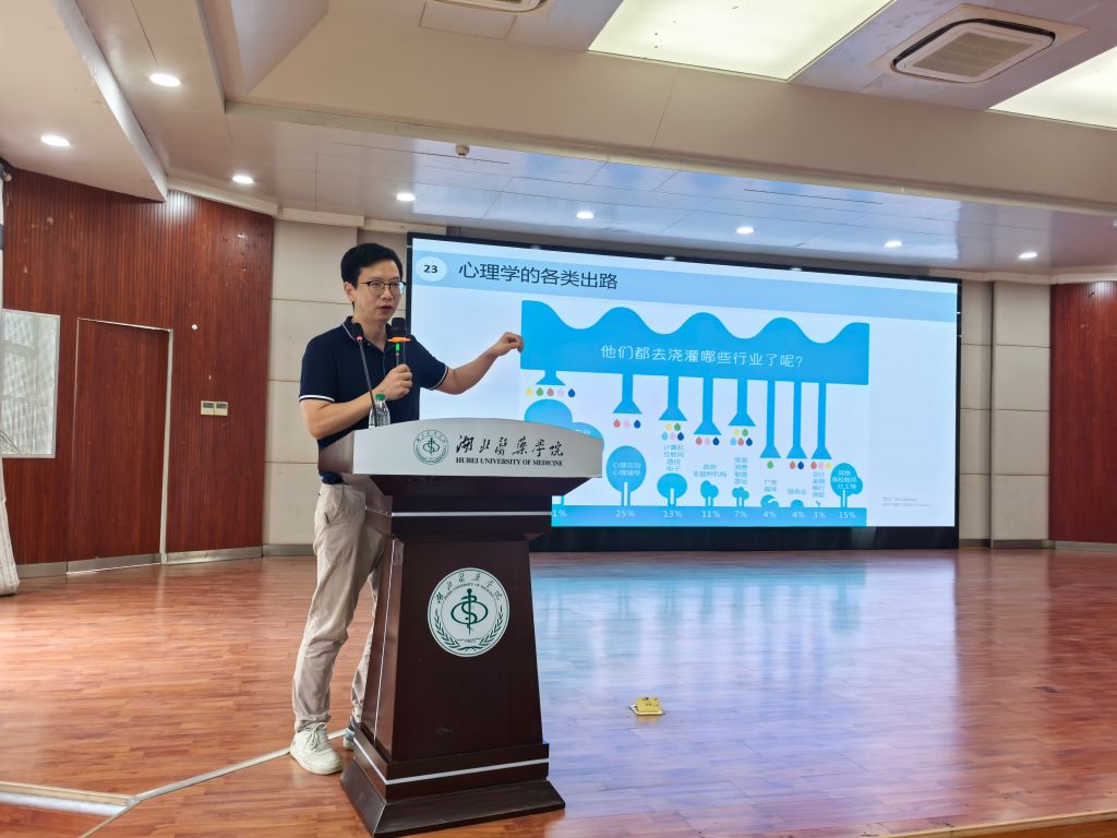应用心理学系副主任翟成蹊博士以“医路心征程:小新的心理学通关攻略与未来地图”为题,聚焦应用心理学生涯启蒙与学业规划,从思维升级、认识专业、填装技能、选择赛道、实践路线五个方面,细致梳理了心理学专业学生的职业发展路径、学业重点以及学习方法技巧,他鼓励新生将短期学习目标与长期生涯发展相结合,提前做好学业与职业的衔接准备。