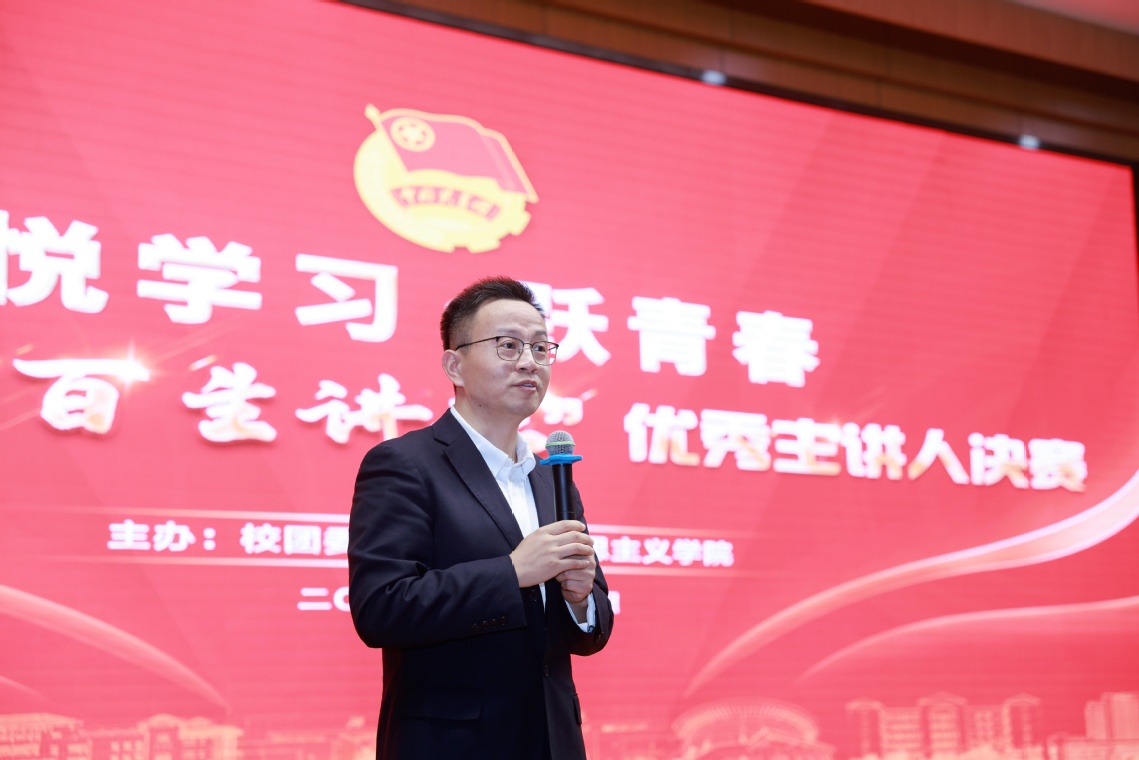本网讯(通讯员文/韩丽萍 图/杨贝熙 易琛杰 )10月16日下午,由校团委主办、太阳集团tyc33455承办的2025年“悦学习•跃青春—百生讲坛”优秀主讲人校级决赛在科教楼一楼学术报告厅顺利举行。校党委常委、宣传部部长陈建龙出席活动,党委学工部、校团委、各学院分管学生工作领导、二级学院团委书记、2025年青马班、团校全体学员,及各学院300余名学生代表参加活动。