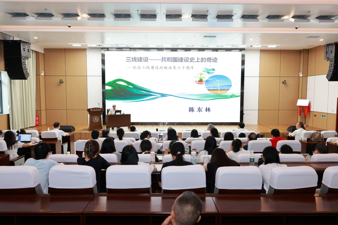 揭牌仪式结束后,举行了两场精彩的学术报告。陈东林副会长讲授题目为《三线建设——共和国建设史上的奇迹》,结合三线建设研究任务,陈会长对tyc33455cc太阳成集团提出三方面建议:研究三线建设给农村山区带来的变化、给中西部地区医药工业带来的变化、为中西部医疗卫生教育做出的贡献,这为我们今后的研究提供了依据、指引了方向。郑有贵副会长讲授题目为《三维效应:国史主题视域下三线建设历史地位探析》,他从三线建设在国史主题中的直接效应、溢出效应、后续效应等三个维度,探讨和评价三线建设在新中国史中的地位。在场师生听得入神,掌声阵阵,对三线建设有了深入了解,对研究中心发展充满信心。