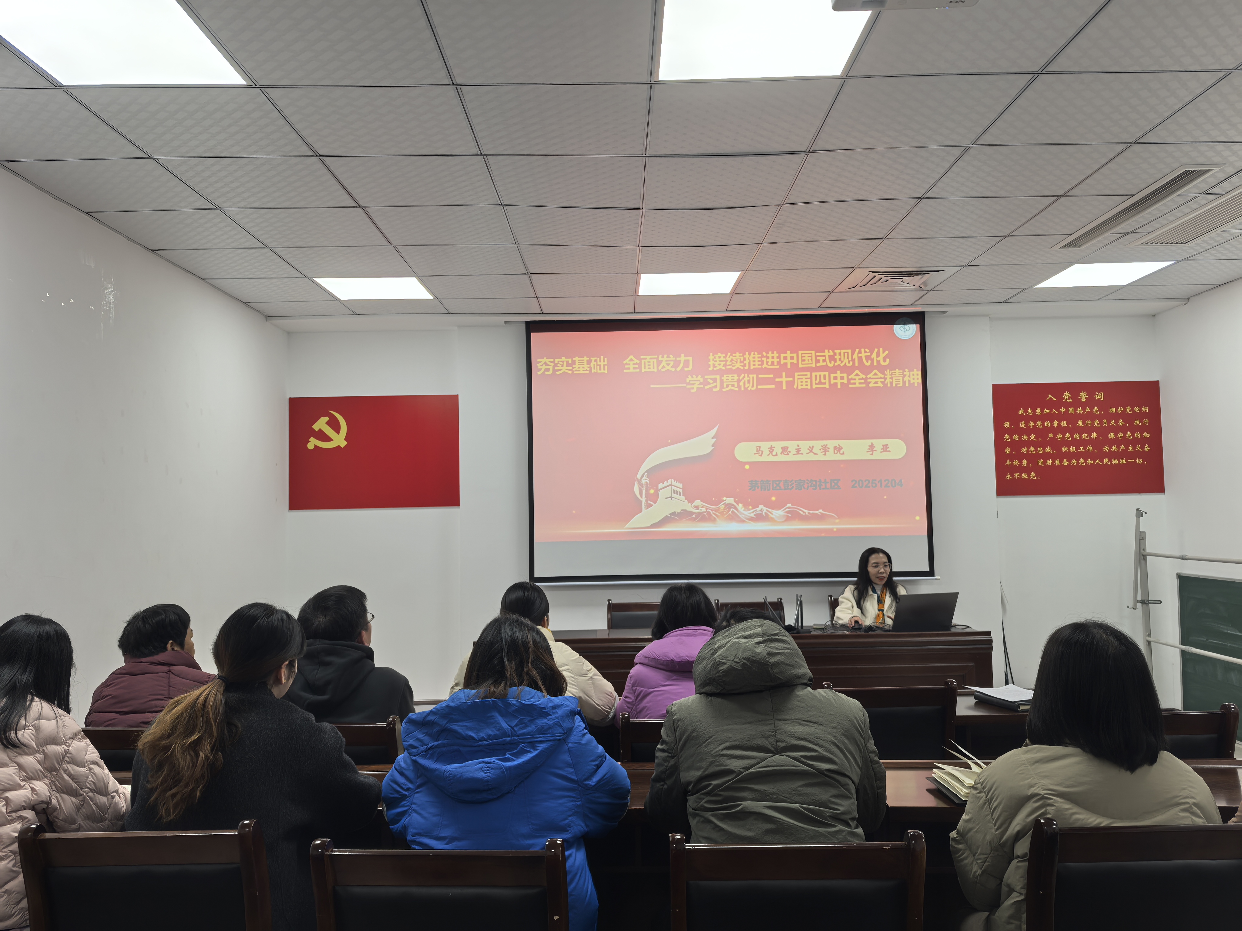 本网讯(通讯员 何宝华)2025年12月4日,中共湖北省委讲师团“百马行动”宣讲团成员、太阳集团tyc33455教师李亚赴十堰市茅箭区彭家沟社区开展党的二十届四中全会精神宣讲,作题为《夯实基础 全面发力 接续推进中国式现代化》的专题宣讲报告,社区干部及群众等20余人参与。