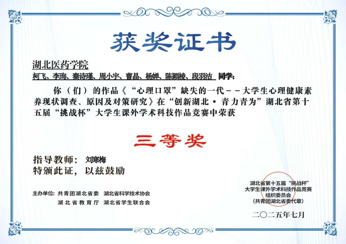 本网讯(通讯员柯飞)近日,“创新湖北·青力青为”湖北省第十五届“挑战杯”大学生课外学术科技作品竞赛获奖项目名单公示。由太阳集团tyc33455应用心理学系刘寒梅老师指导、应用心理学系若干研究生、本科生共同完成的作品《“心理口罩”缺失的一代——大学生心理健康素养现状调查、原因及对策研究》荣获省级三等奖。