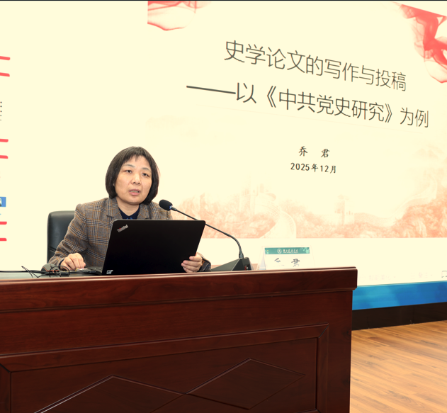 乔君老师以《史学论文的写作与投稿——以<中共党史研究>为例》为题,从中共党史与文献研究院的机构设置切入,介绍了院管期刊概况,重点解读了《中共党史研究》的发展历程、办刊宗旨、核心荣誉与栏目设置。强调,党史研究论文写作必须坚持以科学历史观为指导,牢牢把握党的历史发展的主题主线、主流本质,这既是学术规范的核心要求,更是研究者必须坚守的政治立场与学术品格。随后,乔老师结合具体案例,详细分析了史学论文从选题立意、框架构建、史料辨析,到文字锤炼、注释规范的全流程要点,为师生提升学术研究与论文写作水平提供了极具操作性的方法指引与“路线图”。