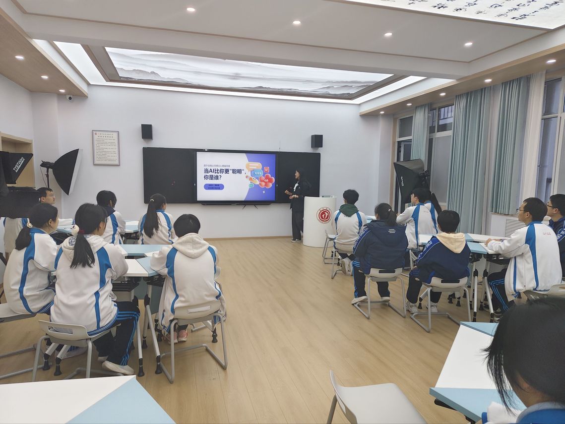 当前,生成式人工智能在青少年群体中普及速度加快,已深度融入学生的学习与生活。相关数据显示,19岁及以下AI用户占比达33.8%,其中学生群体占比高达37.8%。与此同时,部分青少年在使用AI过程中,逐渐出现“智能比较焦虑”、“奋斗意义认知模糊”、“自我价值怀疑”等心理困惑,不利于身心健康成长。基于此,本次辅导课以埃里克森心理社会发展理论为支撑,创新采用情境教学、角色扮演、小组讨论等多样化教学方法,引导学生厘清人与AI的本质区别,树立正确的技术观,增强自我认同感与价值感。