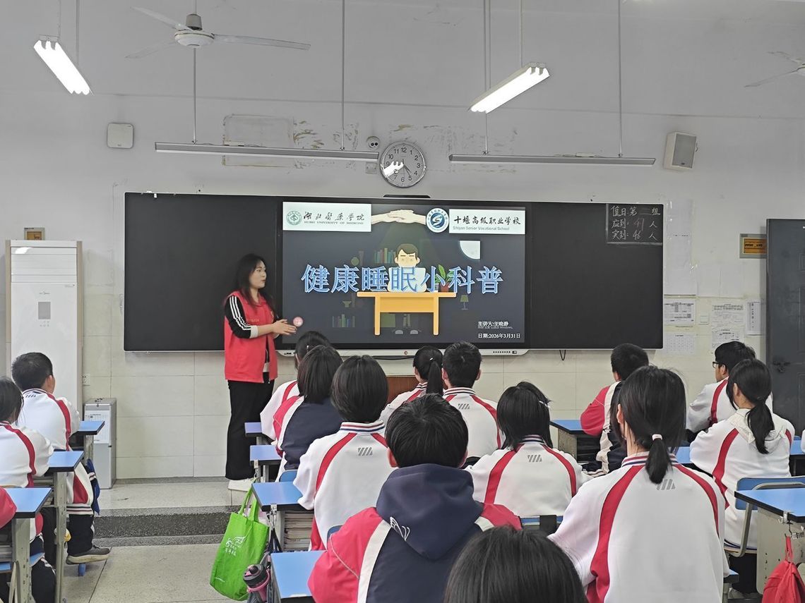 本网讯(通讯员 杨慧敏)为引导高中生关注睡眠健康、缓解学业压力、提升心理调适能力,3月31日下午,tyc33455cc太阳成集团“愈见初心”实践队走进十堰职业高中,以“好梦助心晴,青春向未来”为主题,开展高中心理健康与科学睡眠科普活动,全校学生参与本次科普讲座及互动体验环节,在沉浸式学习中收获实用知识与放松技巧。