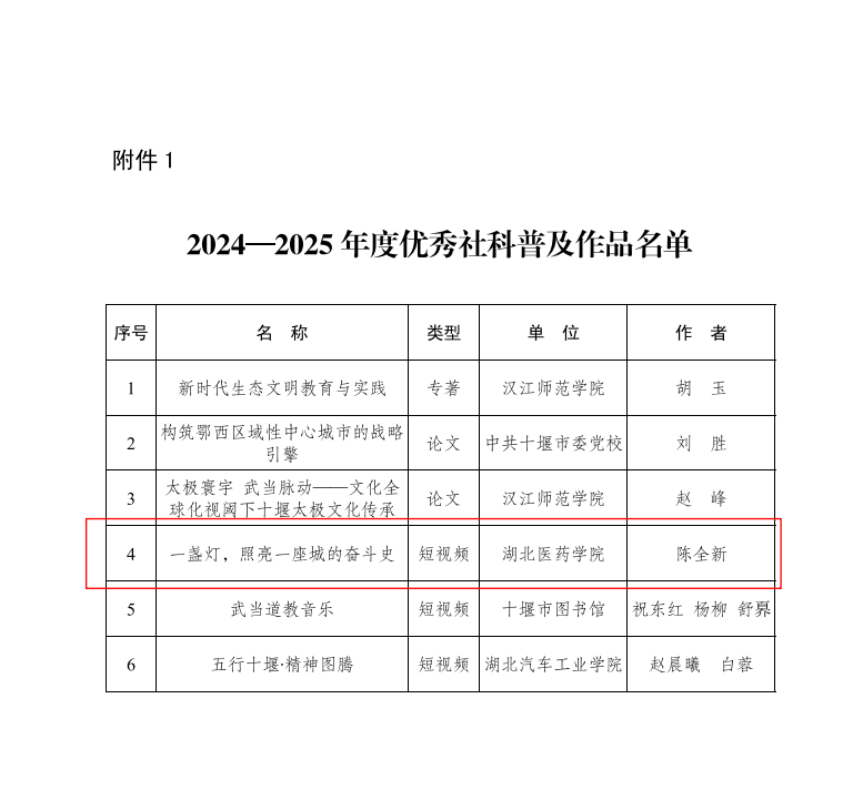 本网讯(通讯员 彭惜芹)近日,十堰市社会科学联合会发布通报,我院3项成果获评2024-2025年度优秀社科成果。其中,彭湘老师《十堰市低空经济赋能乡村振兴的对策研究》、孙磊老师《十堰市城市文化品牌提升策略研究》获评优秀调研报告,陈全新老师的短视频作品《一盏灯,照亮一座城的奋斗史》获评优秀社科普及作品。